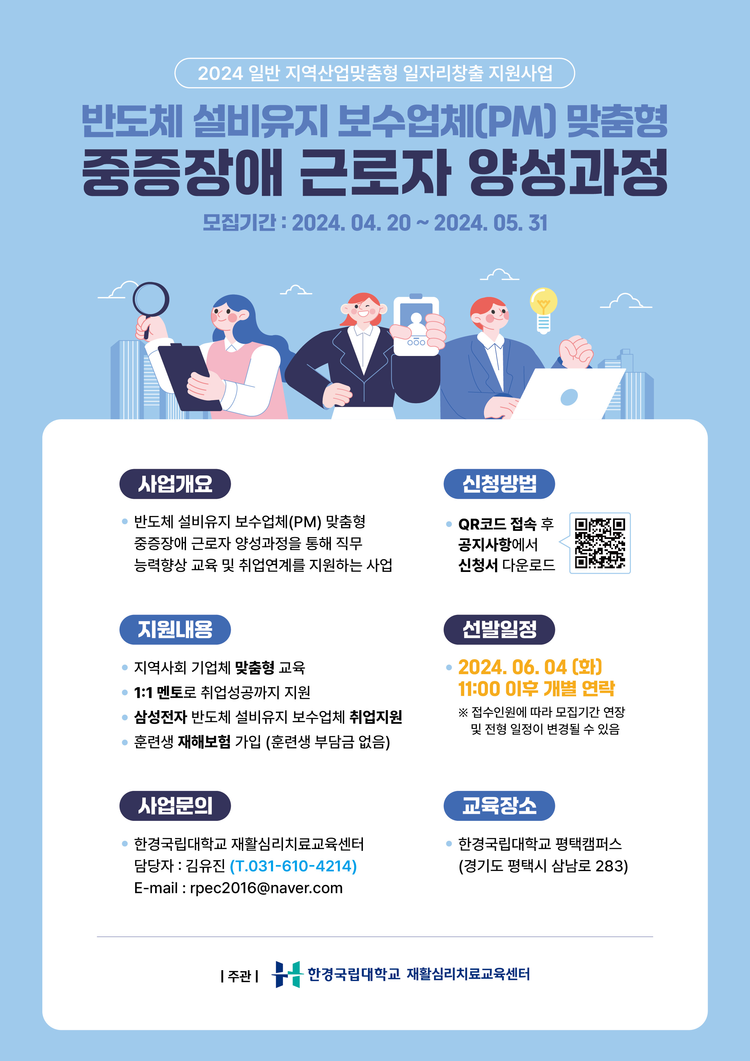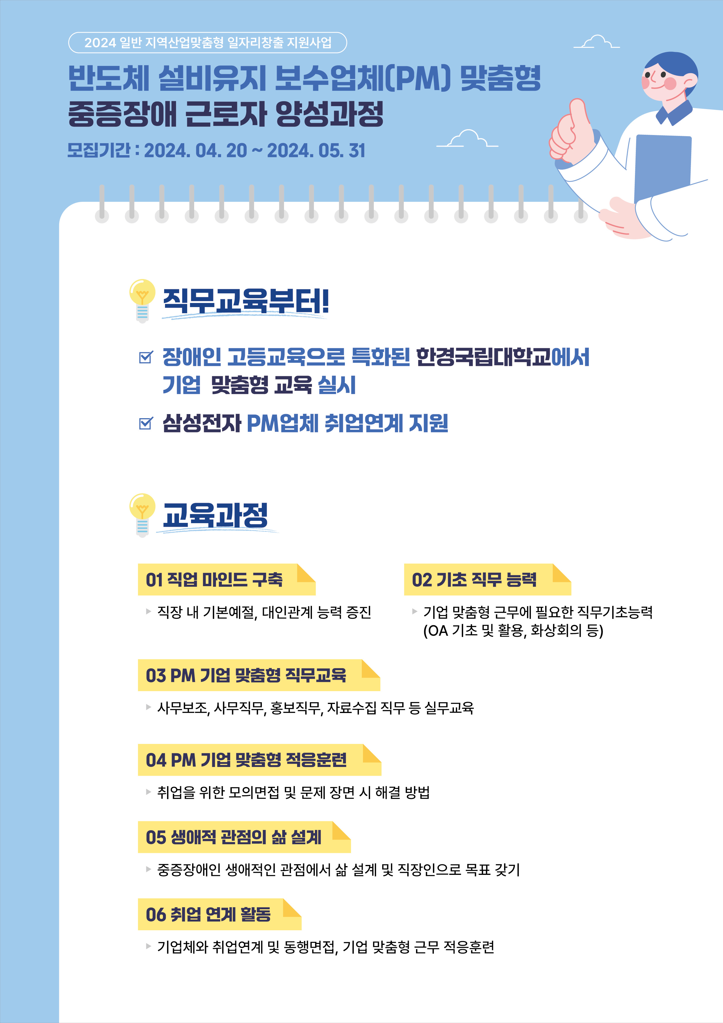 [반도체 설비유지 보수업체(PM) 맞춤형 중증장애 근로자 양성과정]을 실시하게 되어 지원자 모집 하고 있습니다.