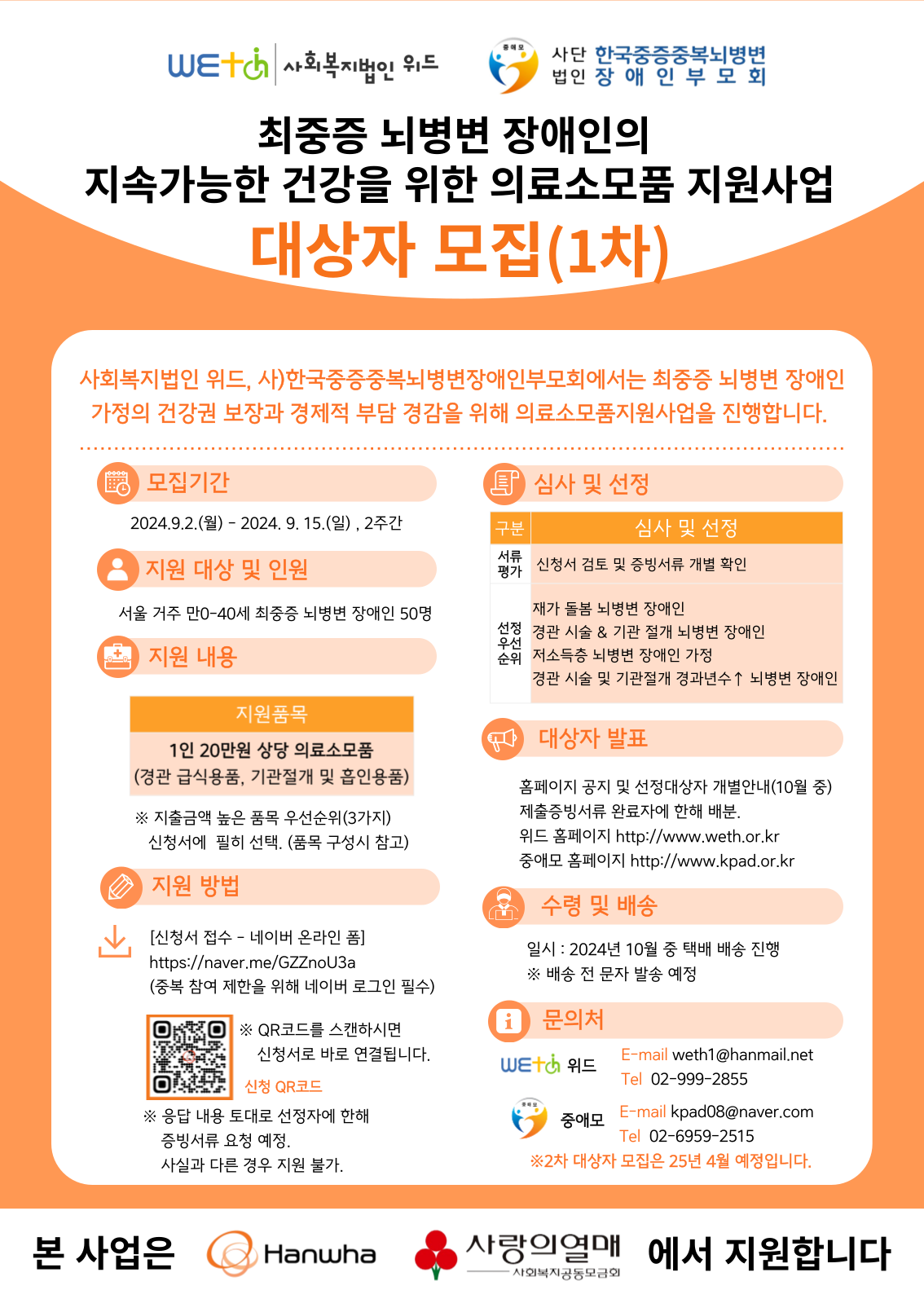 우리 법인은 한화의 후원을 받아 사)한국중증중복뇌병변장애인 부모회와 공동주관하여 최중증 뇌병변 장애인 가정의 건강권 보장과 경제적 부담 경감을 위해 의료소모품지원사업을 진행합니다.