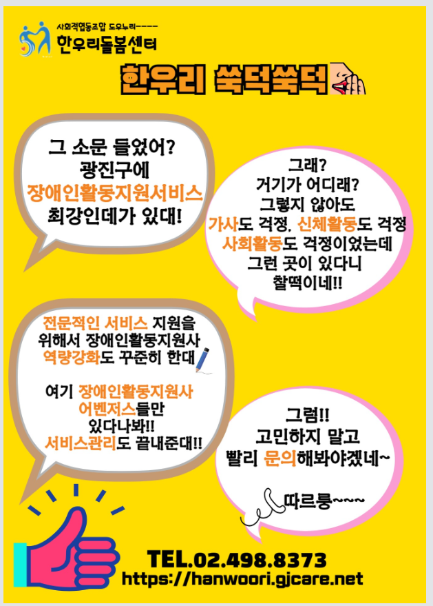 서울시 광진구에 위치한 장애인 활동지원서비스 제공기관 <한우리돌봄센터>입니다.