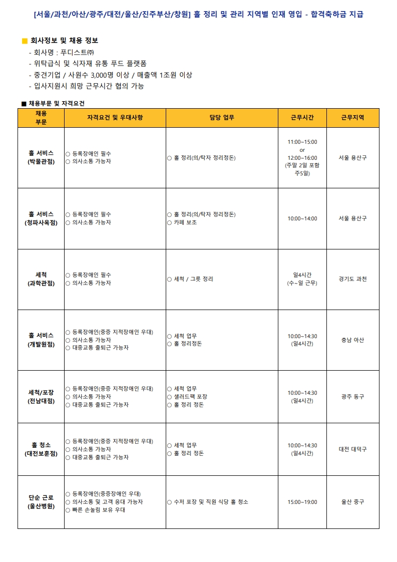 이전글 바로가기 [장애인전형/재택가능] 사무직/디자인/총무 인재 영입 - 합격축하금 지급 다음글 바로가기 IT 전문가로 성장할 기회! 테스트웍스와 함께하는 일경험! - 청년 장애인 일경험 프로그램 BTS Step Up 3기[접수마감]