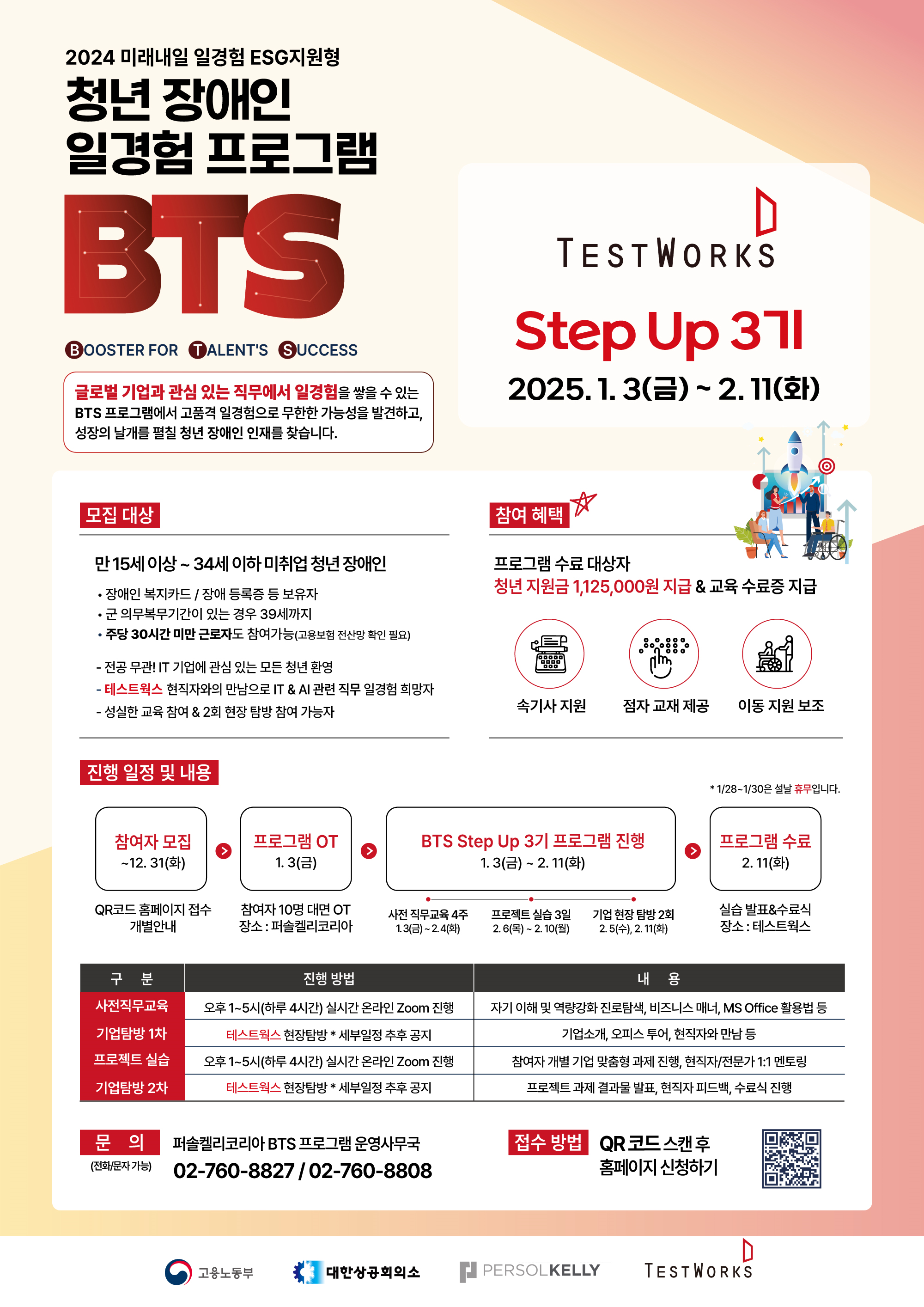 IT 전문기업 테스트웍스와 함께하는 청년 장애인 일경험 프로그램 BTS – Step Up 3기 모집 중!