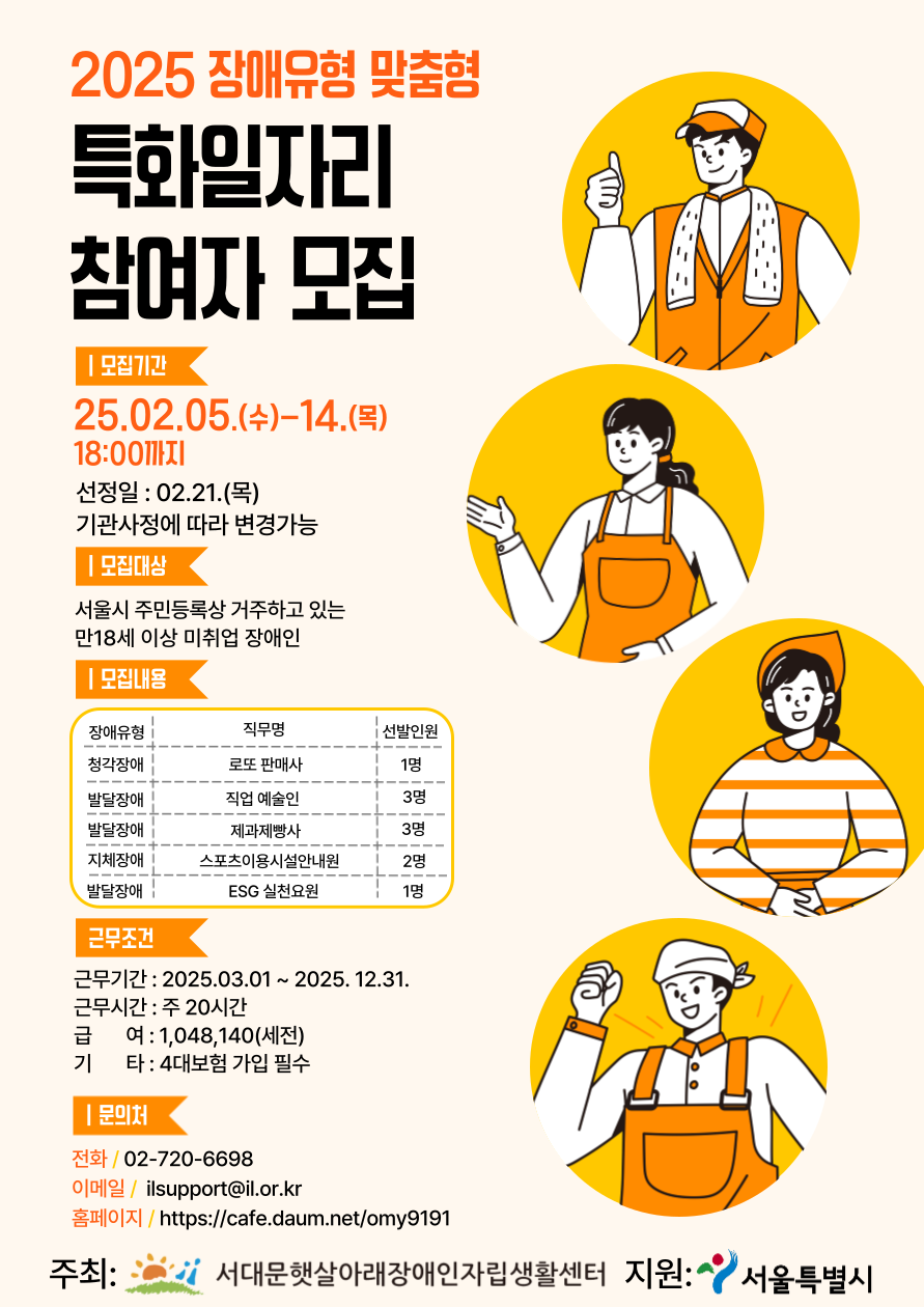 자세한 사항은(서대문자립생활센터 | 2025년 장애유형 맞춤형 특화일자리 참여자 모집공고 - Daum 카페)를 참고부탁드립니다