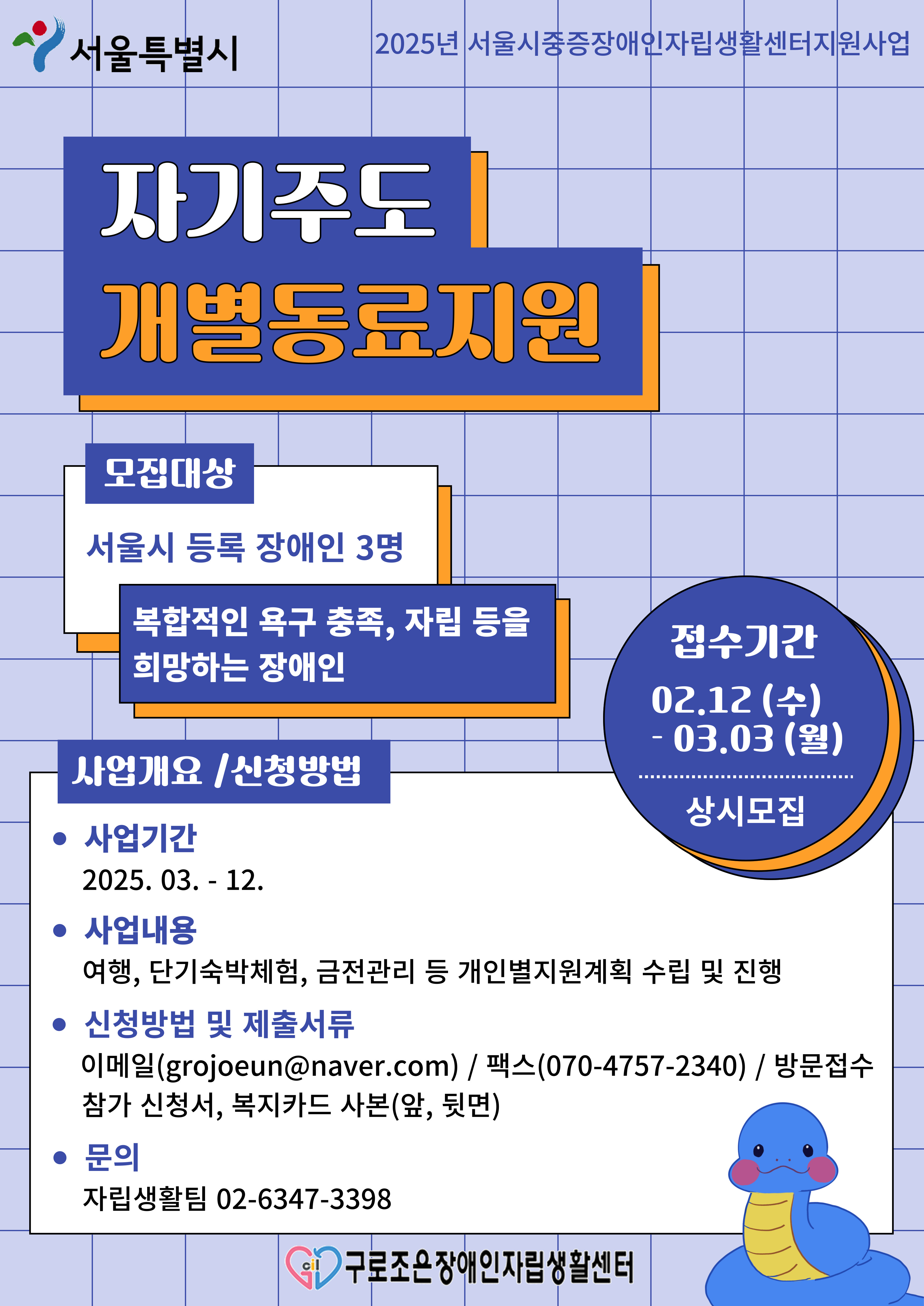 서울시 거주 및 등록 장애인을 대상으로 '자기주도 개별동료지원' 참가자를 모집하고 있습니다.