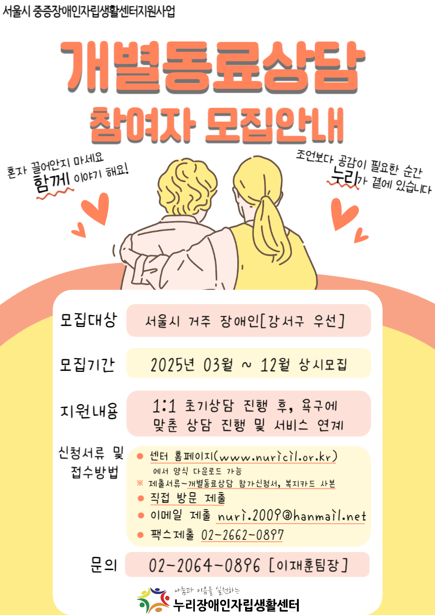 안녕하세요, 누리장애인자립생활센터입니다. 저희 센터에서는 2025년을 맞이하여 "개별동료상담" 사업을 진행하고자 합니다. 하여 동료상담 참여자를 모집하오니 많은 관심과 참여 부탁드립니다!