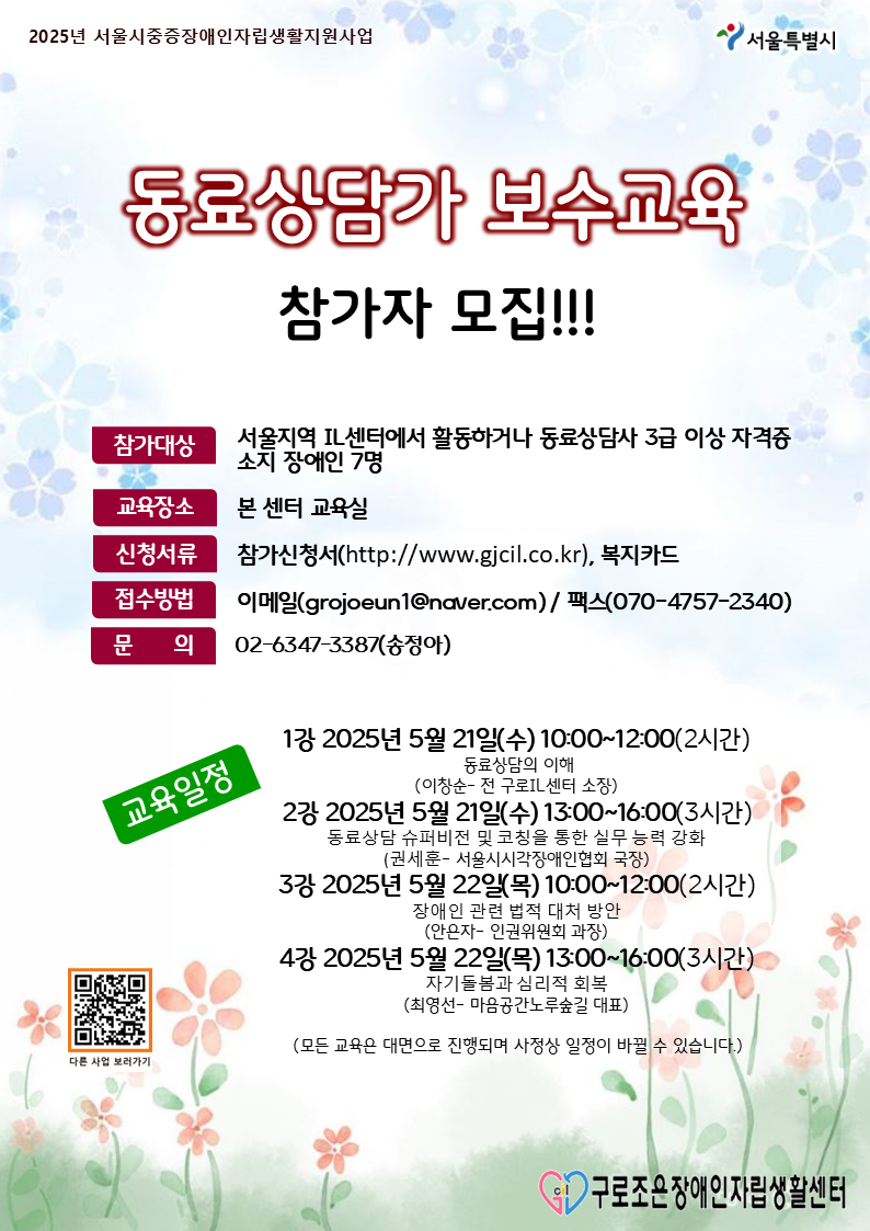 장애인 동료상담가들이 상담 과정에서 발생할 수 있는 직무 소진이나 스트레스 관리기술을 습득하여 더 나은 상담 서비스를 제공하고 전문적인 성장을 도모하기 위한 동료상담가 보수교육에 참가할 동료상담가를 모집하오니 많은 관심과 신청바랍니다.