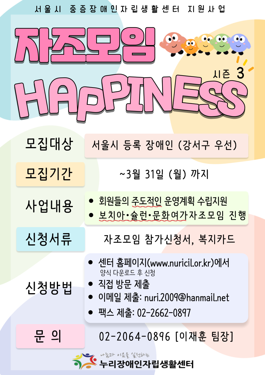 저희 센터에서는 2025년을 맞이하여 자조모임 "HAPPINESS 시즌3" 사업을 진행하고자 합니다.