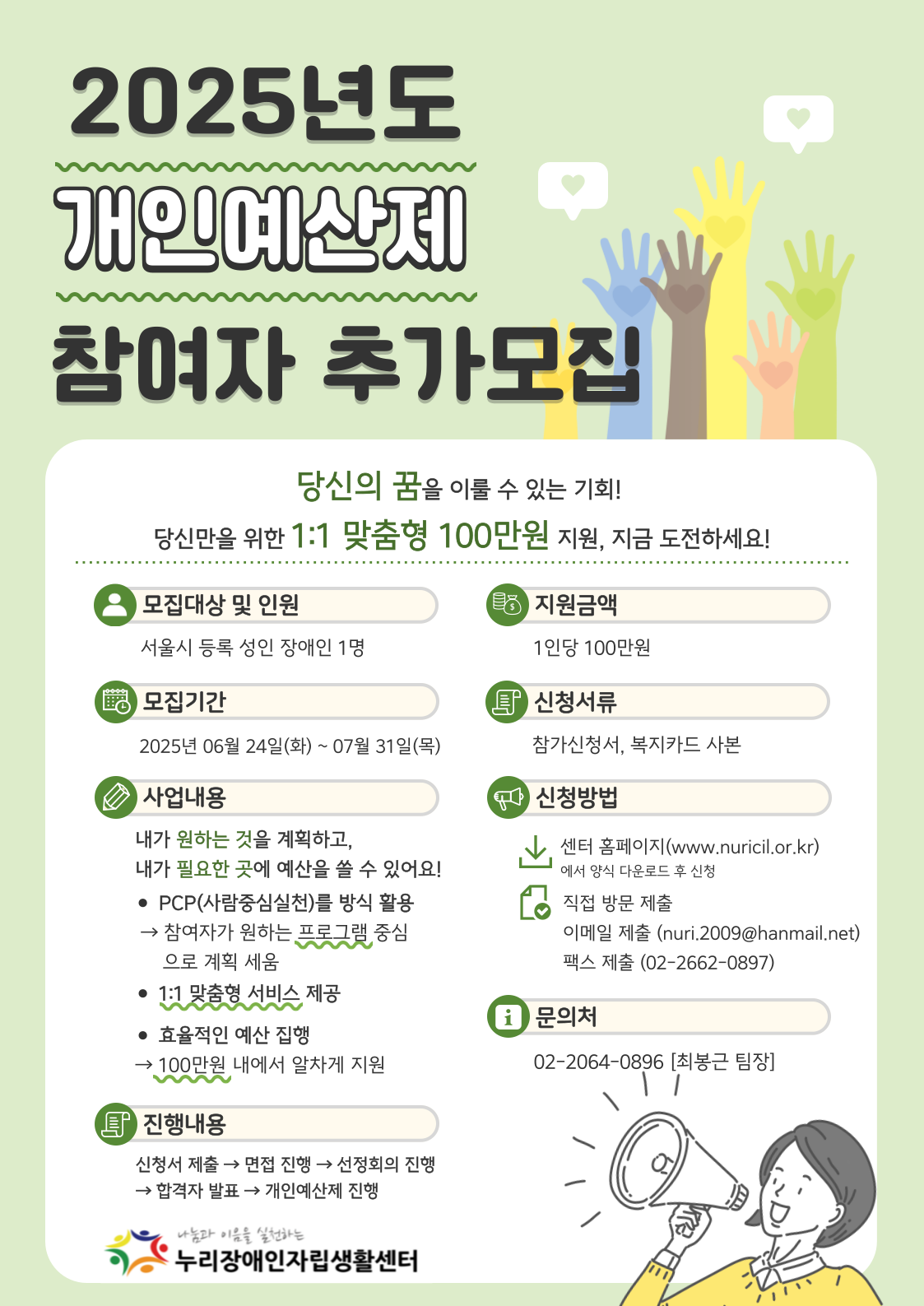 [2025년 개인별자립지원사업 "개인예산제" 참여자 추가 모집 홍보]