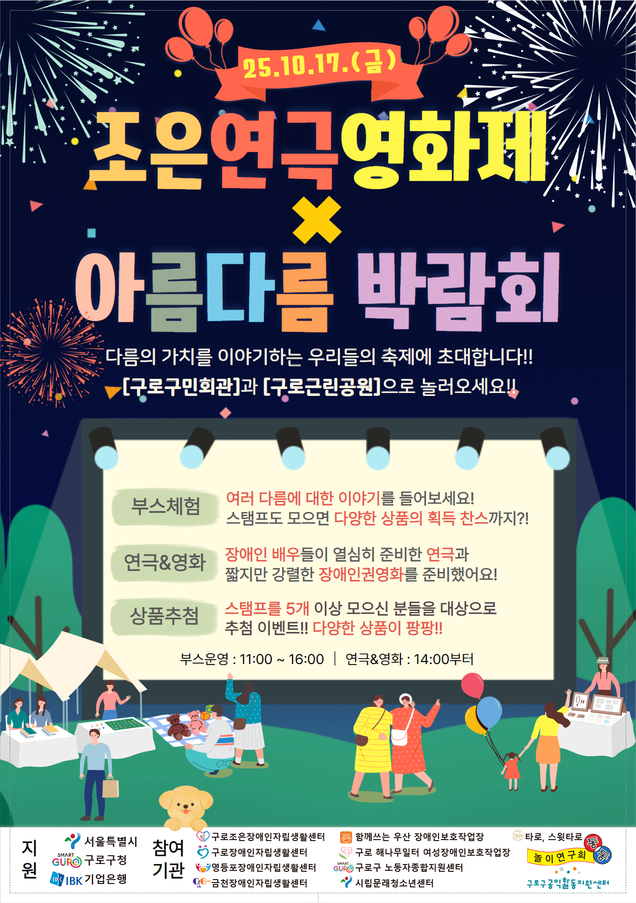 ☐ 아름다름 박람회는 본 센터 포함 장애인자립생활센터 4곳, 보호작업장 2곳, 문래청소년센터, 구로구 노동자종합지원센터, 구로구 공익활동지원센터, 타로 스윗타로, 놀이연구회 통통 총 11개의 기관이 함께 참여해 11시부터 16시까지 다양한 부스를 운영한다. 부스에서는 인물사진 AI 변환, 타로 각기 다른 주제를 중심으로 지역주민들이 서로의 ‘다름’을 직접 경험하고 이해할 수 있는 기회가 마련된다.