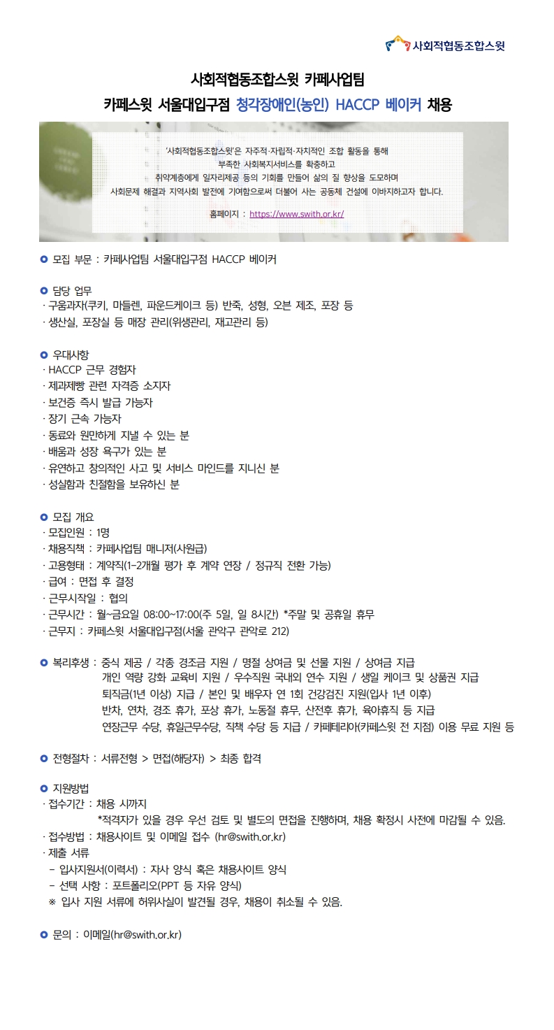 2)사람인: [사회적협동조합스윗] 카페스윗 서울대입구점 HACCP 청각장애인(농인) 베이커 채용(채용시 마감) - 사람인