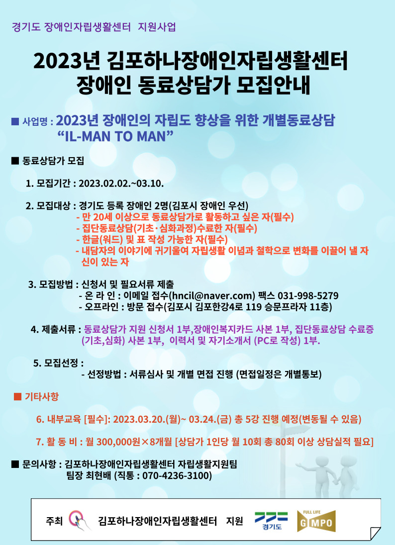 김포하나장애인자립생활센터에서는 2023년 장애인동료상담가 2명을 모집하고 있습니다.