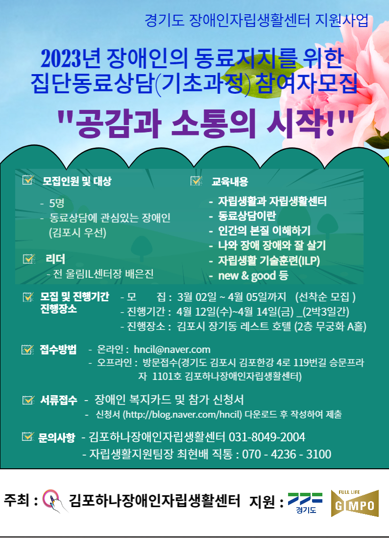 김포하나장애인자립생활센터에서는 집단 동료상담(기초과정) 참여자 (5명) 를 모집하고 있습니다