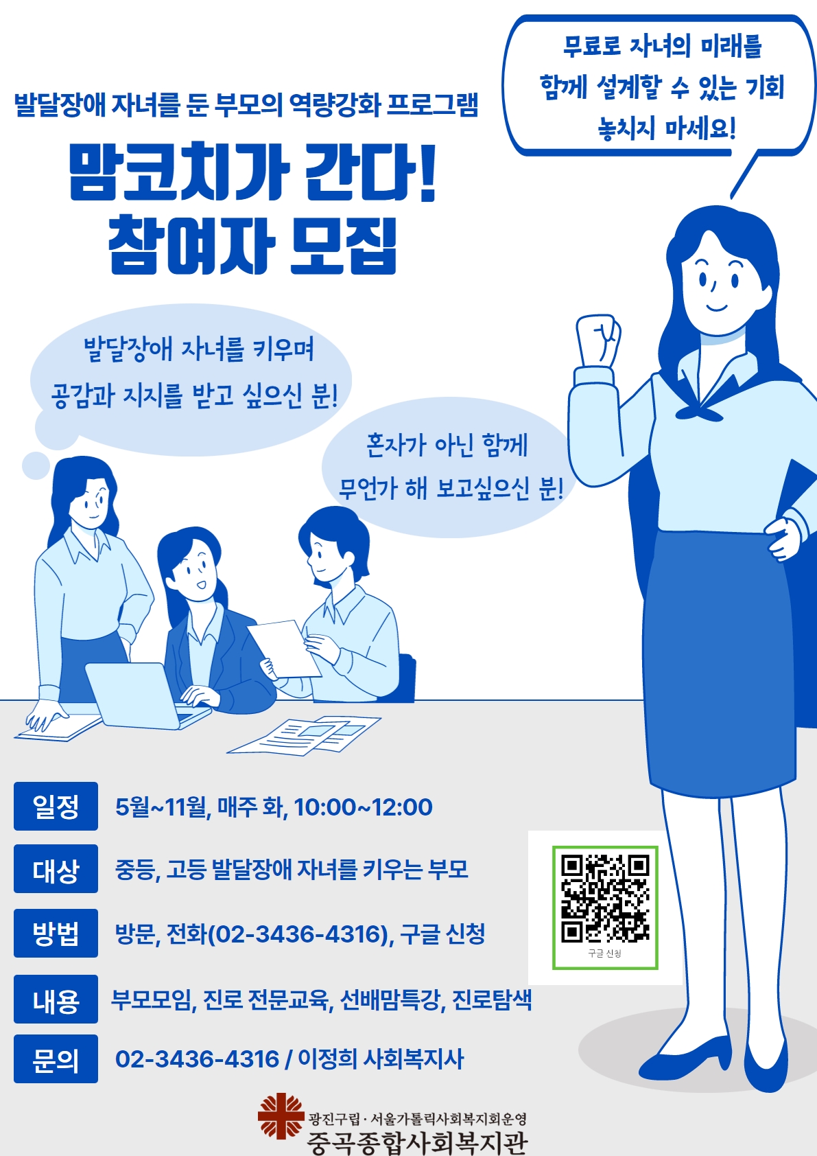 4. 신청: 방문, 전화(02-3436-4316), 홍보지 내 QR코드 구글 신청