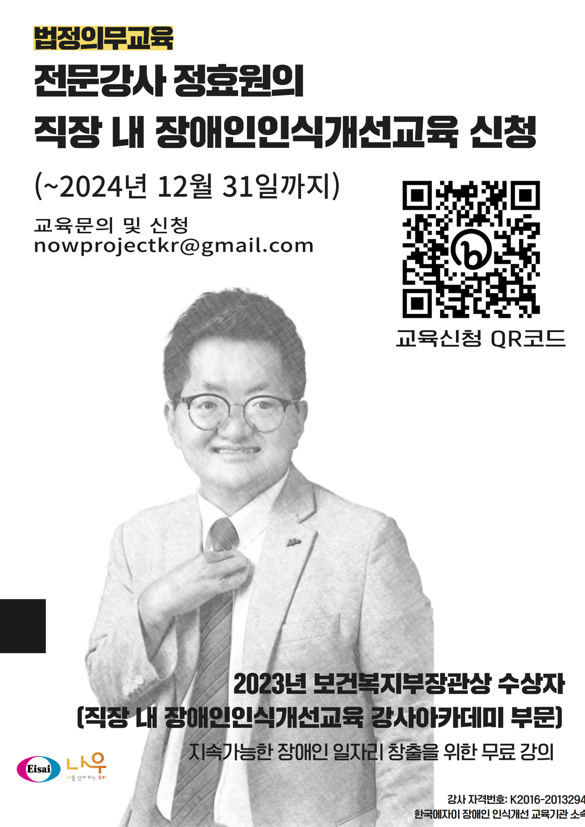 저는 올해로 4년째 헬스케어기업인 한국에자이에서 직장 내 장애인식개선 교육강사로 근무하고 있습니다.