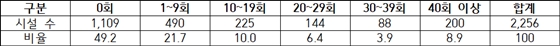 또한 전체 가맹시설 중 10회 이하 집행된 곳이 492곳으로 21.8%였고, 40회 이상 다수 집행된 곳은 200곳으로 8.9%에 불과했다.