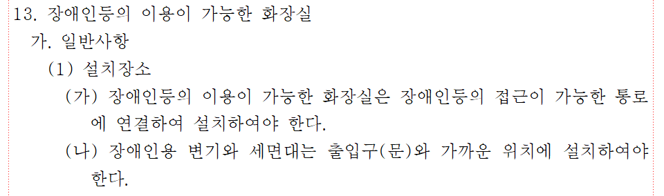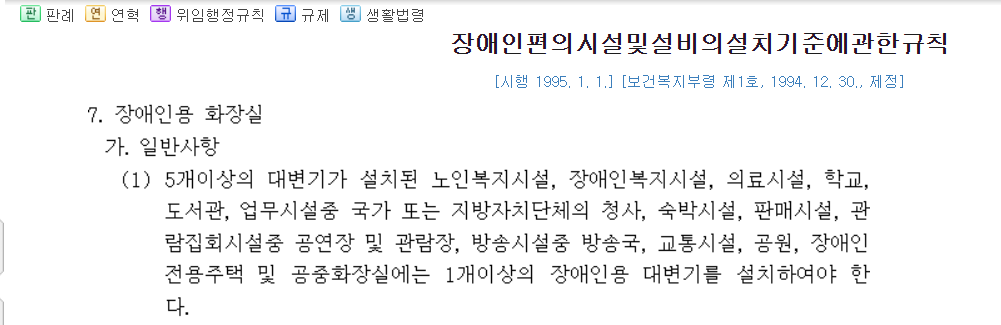 현재「장애인등편의법」에 의하면 공공건물 및 근린생활시설에서의 장애인용 화장실의 설치 비율은 별도로 정해져 있지 않다. 남자용과 여자용을 별도로 설치하도록만 되어 있다.