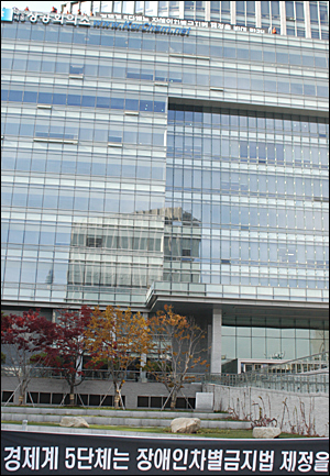 경제계에 장애인차별금지법 제정의 필요성을 인정할 것을 촉구하고 있는 장애인차별금지법제정추진연대 소속 활동가 25명이 24일 오후 1시 30분경부터 서울 남대문에 위치한 대한상공회의소 11층 옥상을 기습 점거하고 고공시위를 벌이고 있다.