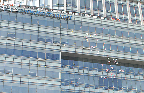 이들은 대한상공회의소 11층 외벽에 “경제 5단체는 장애인차별금지법 제정 반대하지 말라”는 대형 플래카드를 걸었다. 또한 옥상에서 장차법 제정 필요성을 알리기 위한 선전문을 뿌리며 시민들에게 ‘장차법 제정’을 지지해 줄 것을 호소했다.