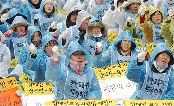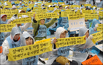 30일 오후 전국에서 모인 장애인부모와 장애인 당사자, 학생, 교사 등 1천여명(주최측 추산)이 서울 광화문 세종문화회관 앞에 모여 ‘국무총리 면담 촉구 및 장애인교육지원법 제정을 위한 장애인교육주체 총력 투쟁 결의대회’를 개최, 한명숙 국무총리와의 면담을 촉구했다.
