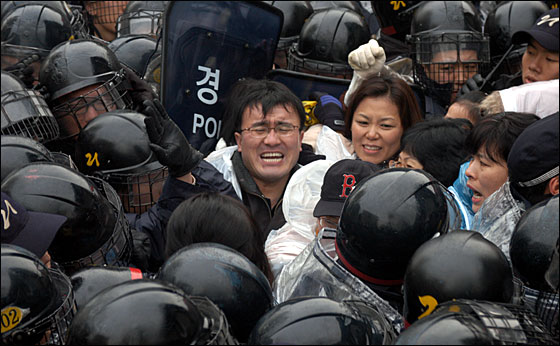 전국장애인교육권연대측은 이날 결의대회를 마치고 시민들에게 장애인교육지원법 제정의 중요성을 알리기 위한 거리행진을 하려고 경찰에 미리 신고서를 냈지만, 경찰은 이를 불허했다. 지난 3월 29일 같은 목적으로 삼보일배 행진을 신청했을 때 허가를 내줬던 경찰이다. 결의대회 참가자들은 명확한 근거도 없이 행진을 거부하는 것을 이해할 수 없다면서 전경들과 맞섰다.