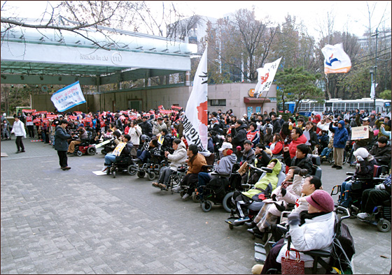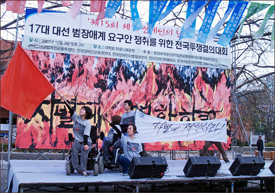 17대 대선을 맞아 구성된 범장애계대선공약실현공동행동(이하 범장애계공동행동)은 3일 오후 2시 대학로 마로니에 공원에서 ‘제15회 세계장애인의 날’을 맞이하여 ‘17대 대선 범장애계 요구안 쟁취를 위한 전국투쟁결의대회’를 개최했다.