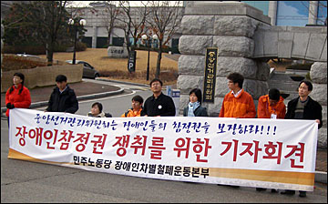 민주노동당 장애인차별철폐운동본부는 "오는 12월 19일은 제17대 대통령선거를 하는 날이다. 우리나라 국민이면 누구나 신성하고, 소중한 투표권을 행사하는 날이다. 하지만 아직도 우리나라에서는 장애인들의 참정권은 인정하지 않는다"고 지난 11일자 성명을 통해 꼬집었다.