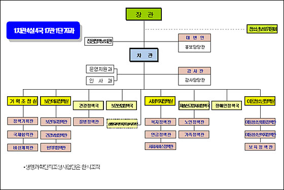 기존 아동정책과 청소년정책을 통합해 아동청소년정책실을 신설하고, 기존의 보험연금정책본부를 해체해 건강보험업무는 보건의료정책실로, 국민연금업무는 사회복지정책실로 배치한 것이 특징이다.