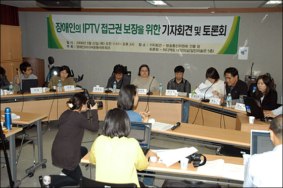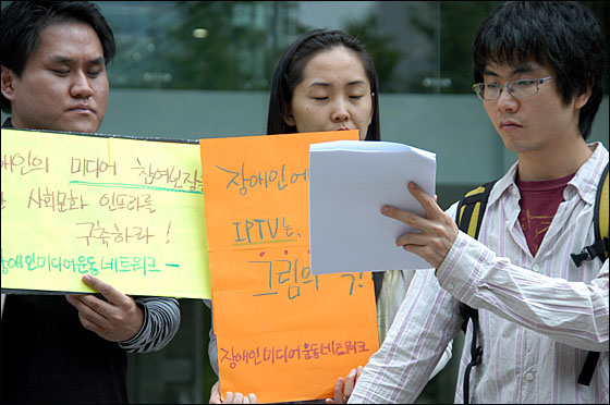 장애인미디어운동네트워크는 기자회견문을 통해 "방송통신위원회는 인터넷멀티미디어방송사업법, 일명 IPTV법안을 작년 12월 사업자의 이해만 대변한 채 통과시켰다"면서 "시행령은 5월 현재 입법예고된 상태인데, 장애인 접근권을 보장하기 위한 조치는 하나도 없다"고 꼬집었다.