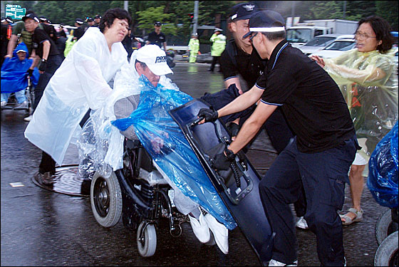 이 과정에서 휠체어장애인 활동가들이 도로변으로 행진을 하려고 하자 경찰이 이를 막아서면서 몸싸움이 벌어졌다. 이 과정에서 서 씨 외에도 참가자 3명이 부상을 입고 응급처치를 받는 등 크고 작은 사고들이 발생했다.