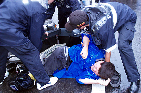 대한안마사협회 소속 시각장애인 안마사 서진원씨는 2일 오후 개최된 ‘시각장애인 생존권 보장을 위한 합헌 촉구 결의대회’에 참가해 가두행진을 벌이던 도중 시위행렬이 경찰에 의해 막히자 몸싸움을 벌이다 전경이 들고 있는 방패 모서리에 맞아 눈을 다쳤다.
