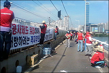 시각장애인 안마사들이 지하철 2호선 잠실철교 도로 한 가운데를 점거한 채 피부미용사 업무범위를 전신으로 허용한 보건복지가족부를 규탄하는 농성을 벌이고 있다.