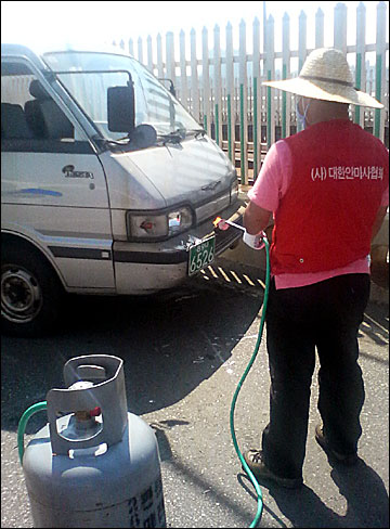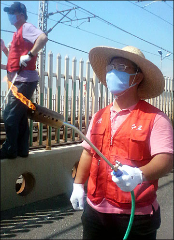 경찰이 시위대를 강제철수하려고 하자 화염방사기에 불을 부치고 경찰과 대치하고 있다.