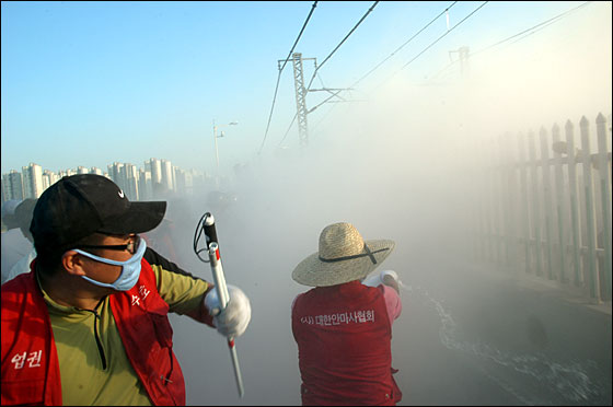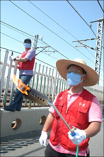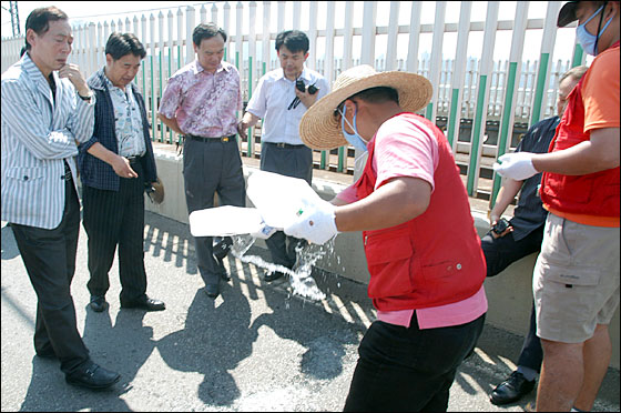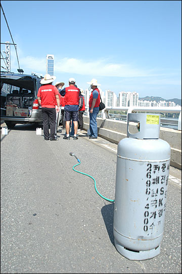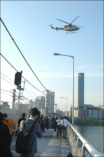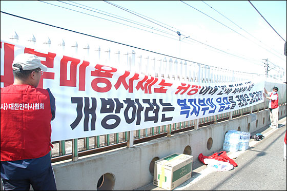 시각장애인 안마사 30여명이 지하철 2호선 잠실철교 도로 한 가운데를 점거하고 피부미용사 업무범위를 전신으로 허용한 보건복지가족부를 규탄하는 농성을 벌였다