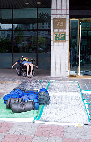 탈시설공투단은 지난 17일 오후 2시께 양천구청 앞에서 ‘석암재단 이사회 전원 해임 촉구 결의대회’를 개최한 후, 무기한 천막농성을 결의하고 천막농성을 시작하려했으나 경찰 측에서 천막을 강제로 압수함에 따라 시멘트 바닥에 스티로폼을 깔고 노숙농성에 돌입했다.