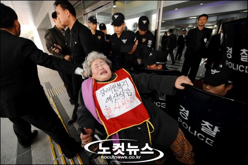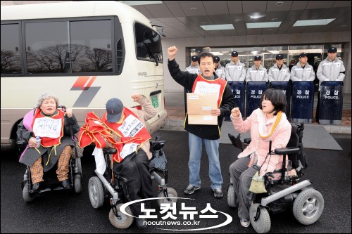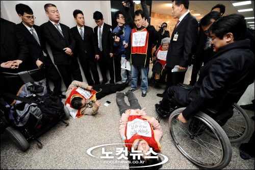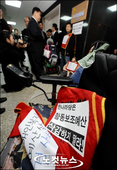 전국장애인야학협의회, 전국장애인차별철폐연대, 장애인이동권연대, 한국장애인자립생활센터협의회, 장애인차별금지추진연대, 한국장애인단체총연맹 등 장애인단체 회원들과 민주당 박은수 의원은 9일 오전 국회 정론관에서 장애인복지예산 삭감을 반대하는 기자회견을 열고, 한나라당 홍준표 원내대표에게 요구안을 전달하러 가던 중 국회 경위들에게 쫓겨나고 말았다.