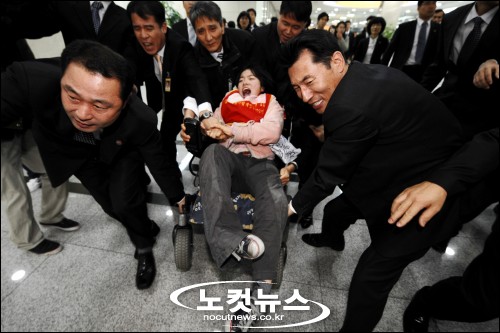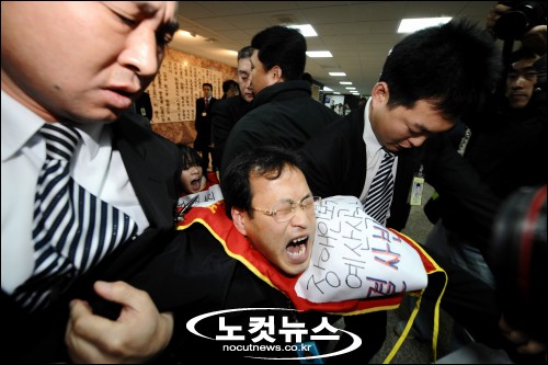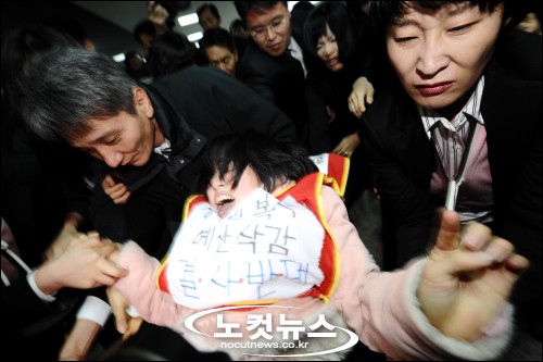 장애인복지예산 삭감 반대를 주장하며 한나라당 홍준표 원내대표와 면담을 하러 이동하던 중 국회 경위들에게 쫓겨나오는 사태가 벌어졌다.