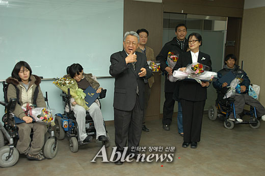 ▲이준애=활동보조인서비스를 신청하기 위해 보건소에서 평가를 받는 과정에서 언어장애 등을 이유로 당사자를 무시한 채, 함께 간 남편에게 개인의 프라이버시에 해당되는 문제까지 질문하는 등의 문제가 발생하자 이를 가벼이 넘기지 않고 문제를 제기해 보건소장의 사과와 함께 재발방지를 위한 인권교육을 받도록 하는 등 변화를 이끌어냈다. 장애인 당사자를 무시하는 등의 괴롭힘은 일상적으로 일어나지만 오히려 그 점 때문에 그냥 지나치는 일이 많다. 그러나 이준애 님은 이에 대해 문제를 제기함으로써 사회적 인식을 바꾸는 데 크게 기여해 수상자로 선정됐다.