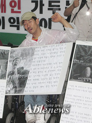 둑실동 대규모 장애인수용시설을 반대하는 인천장애인차별철폐연대의 노숙농성이 4일차를 맞고 있다. 목에 피켓을 걸고 계양구청 앞에서 시위를 벌이고 있는 모습. ⓒ인천장애인차별철폐연대