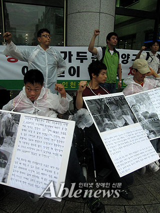 둑실동 대규모 장애인수용시설을 반대하는 인천장애인차별철폐연대 회원들이 목에 피켓을 걸고 계양구청 앞에서 시위를 벌이고 있는 모습. ⓒ인천장애인차별철폐연대