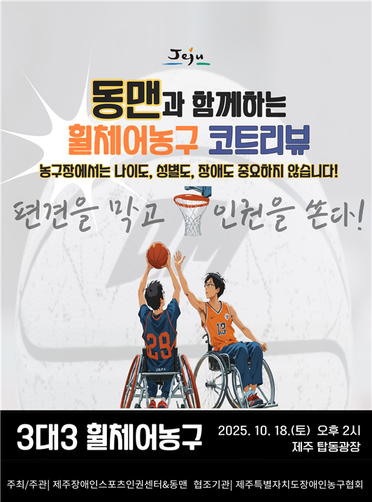 【에이블뉴스 이슬기 기자】제주장애인스포츠인권센터가 오는 18일 오후 2시 제주 탑동광장에서 ‘동맨과 함께하는 휠체어농구 코트리뷰’를 개최한다.