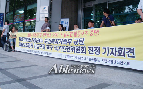 전국장애인차별철폐연대 최용기 공동대표(지체장애 1급), 전순득(66세, 시각장애 1급)·김광성(66세, 지체장애 1급)씨 등 3명은 지난 7일 서울 무교동 국가인권위원회 앞에서 ‘활동보조권리 긴급구제 촉구 국가인권위 진정 기자회견’을 열고, 전재희 보건복지가족부 장관을 상대로 진정을 제기했다.