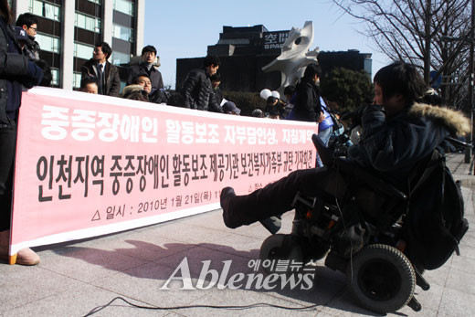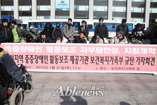 인천지역의 장애인활동보조서비스 제공기관들은 21일 보건복지가족부 청사앞에서 기자회견을 열고 활동보조서비스 본인부담금 인상 등 정부의 활동보조서비스 사업 지침에 대해 규탄했다.