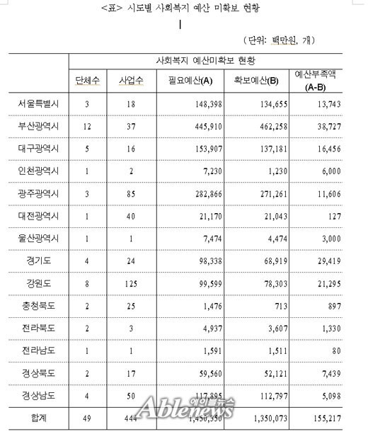 부족 현상이 가장 심각한 곳은 부산으로 16개 자치구 중 12곳에서 예산 미반영 사태가 나타났다. 규모는 37개 사회복지사업에 387억원이었다. 이어 대구시가 5개 자치구 16개 사업에 총 165억원, 서울시 137억원, 광주시 116억원, 인천시 60억원, 울산시 30억원이 각각 부족했다.