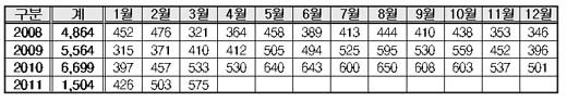 윤 의원이 경찰청으로부터 받은 자료에 따르면 최근 3년간 지적장애인 실종 발생 신고는 2008년 4,864명에서 2009년 5,564명, 2010년 6,699명으로 지속적으로 증가하고 있다. 3월 현재까지의 실종 발생 신고는 1,504명으로 나타나고 있다.