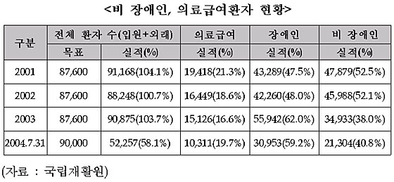자료에 따르면 지난 2001년 비장애인 환자비율은 52.5%로 최근 4년간 가장 높았고, 2002년에는 52.1%, 2003년 38%, 올해 7월 31일 현재 40.8%로 나타났다.