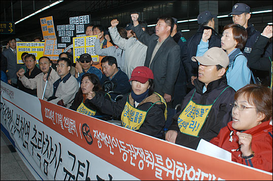 “더 이상 죽을 수 없다. 장애인 이동권 보장하라! 이동보장법 제정하라!” 2일 오후 지하철 1호선 부천역 승강장에 모인 장애인이동권연대 회원들과 시민사회단체 인사들은 기자회견을 열어 한 장애인의 죽음에 절규하며, 이동보장법 제정이 절실하다고 정부에 촉구했다.