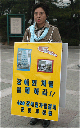 이날 첫 1인 시위에 나선 김경애 장애인참교육학부모회 대표는 낮 12시부터 1시까지 청와대 앞에서 ‘장애인차별 철폐’, ‘장애인 교육지원법 즉각 제정’ 등의 문구가 새겨진 피켓을 앞뒤로 걸치고 대통령 면담을 촉구했다.