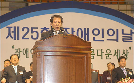[현장 4보]오전 11시20분/서울 올림픽공원 펜싱경기장 내부=휠체어 육상 금메달 리스트 홍석만 선수와 탤런트 정선경씨가 장애인 인권 헌장 낭독했다. 장애인 인권헌장은 '장애인은 장애를 이유로 정치, 경제, 사회, 교육 및 문화생활 등 모든 영역에서 차별 받지 아니한다' 등 13개항으로 구성돼 있다. 김근태 보건 복지부장관이 김상호씨 등 11명에게 유공자 포상을 전수했고, 이석형 국회보건복지위원장도 배형진군 등 5명에게 올해의 장애극복상을 시상했다.