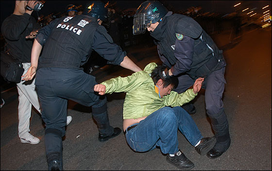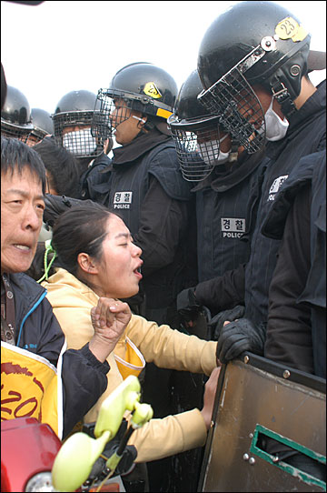 [현장 25보]오후 7시 25분/마포대교 중간=420공동투쟁단과 경찰의 충돌이 절정까지 다다른 상황. 몸싸움이 더욱 격렬해지고 있다. 420공동투쟁단 도경만 집행위원장은 “왜 우리의 요구를 들어주지 않느냐? 이렇게 되면 충돌할 수밖에 없다”며 경찰에 항의. 본지 현장 기자 왈, “이러다가 인명사고까지 발생할 것 같다.”