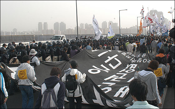 [현장 17보]4시35분/서울 마포대교 50m 전방=420공동투쟁단이 마포대교 50m 전방까지 나아갔으나 전경들이 막고 있어 더 이상 행진하지 못하고 있다. 경찰은 420공동투쟁단이 마포대교를 건너는 것을 불허한다는 입장으로 충돌이 예상된다.