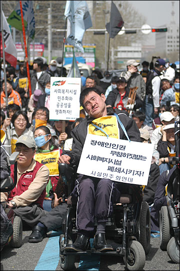[현장 12보]오후 1시50분/서울 공덕동 로터리=총 21개 단체가 참여하고 있는 사회복지시설 민주화와 공공성 쟁취를 위한 전국연대회의 출범식이 끝났다. 한국자립생활센터협의회 최용기 회장은 출범선언문을 통해 ▲사회복지시설 개방형 이사제 도입 ▲전국 미신고시설 민관합동 인권 실태조사 실시 ▲탈시설화, 자립생활 정책 강구 ▲복지부, 지자체 관리감독 실질화 등을 요구했다. 현재 500여명 군집한 상태이며, 420장애인차별철폐 투쟁결의대회 참석 위해 장애인들이 지속적으로 모이고 있다.